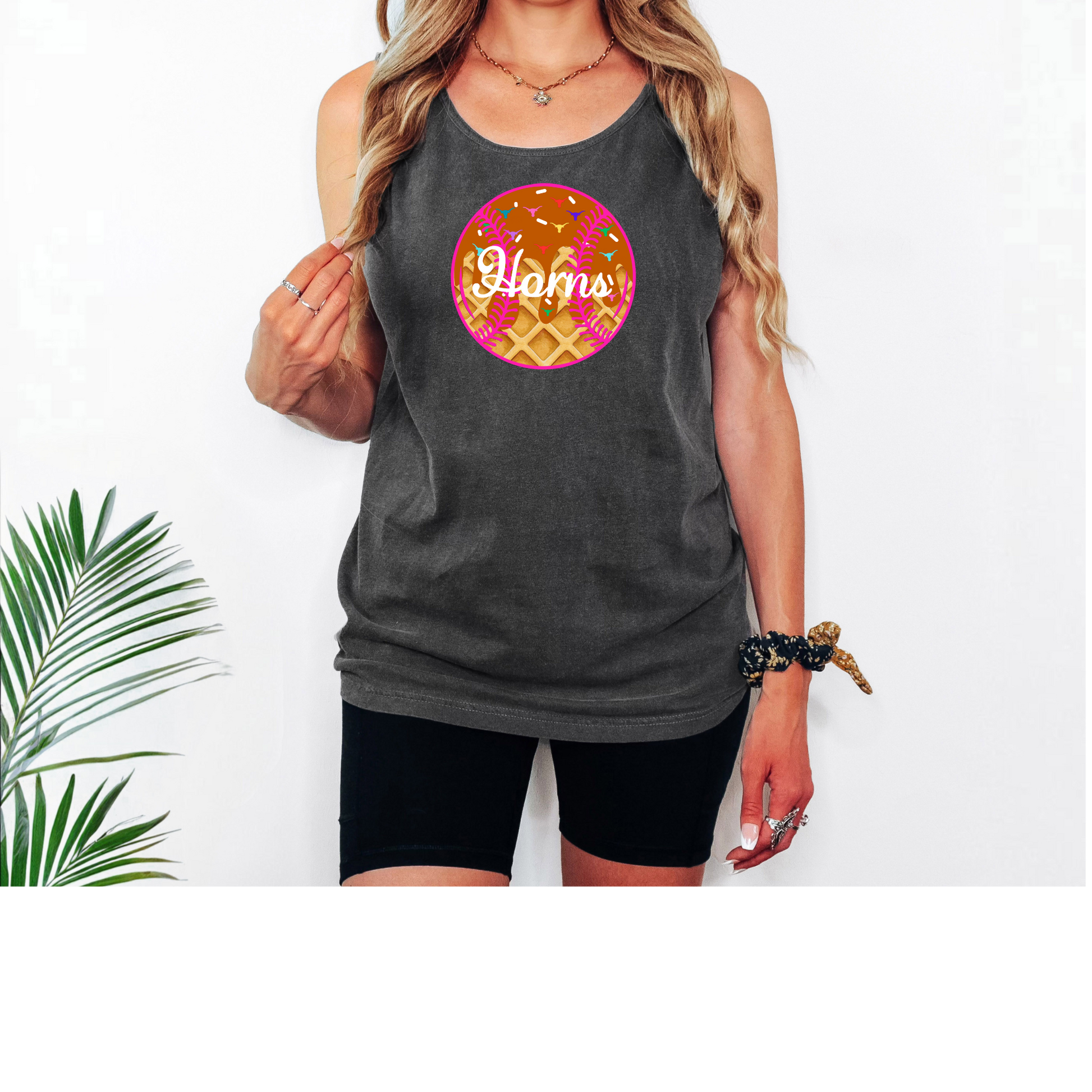 Design features vibrant detail with a waffle-cone inspired background, pink stitch pattern, and the word Horns in a bold script