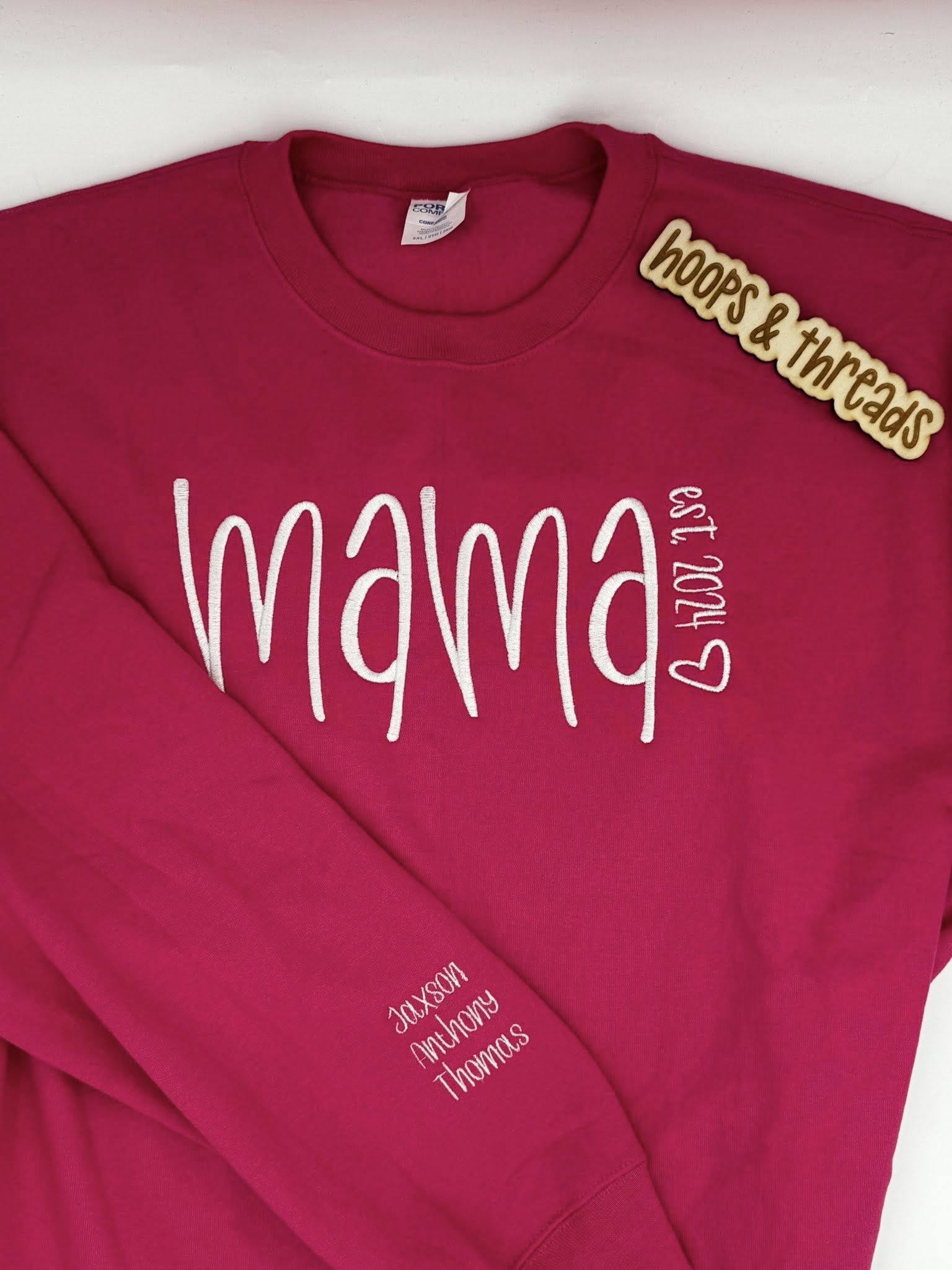 This Mama sweatshirt features clean script embroidery with an established year detail, creating a timeless piece that celebrates motherhood without being overdone. Finished with optional sleeve embroidery, it’s meaningful, wearable, and easy to style year round.