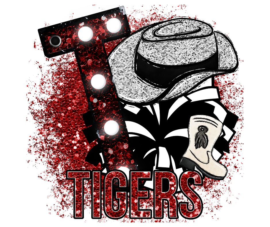 The price includes the high-quality direct to film transfer featuring a glittery marquee “T,” sparkling cowboy hat, bold pom background, and signature drill team boot, all accented in striking red, black, and silver. Fifteen percent of every sale will be donated back to support the Tigers Drill Team program.